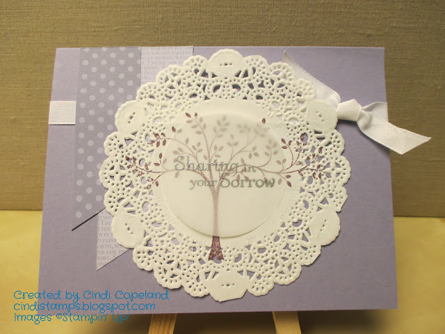 Unfortunately, I've had a need for sympathy cards recently, so I thought I'd use this sketch to make a few. Thoughts & Prayers always seems to be my go-to set for this type of card, even though there have been new sets since this one came out. I stamped the tree in Perfect Plum directly onto a doily, then stamped the sentiment in Versamark on vellum, embossed it with silver powder, and punched it out with the 2" circle punch and layered it on top. (I used some non-SU Tombow Vellum Adhesive for this. Just rolled it on behind the words so it would be invisible.) The banners are cut from "vintage" DSP from my stash. Although this color is still in the collection, I liked these more muted patterns from the past for this card. I added the "vintage" 1/4" taffeta ribbon from my stash as well.