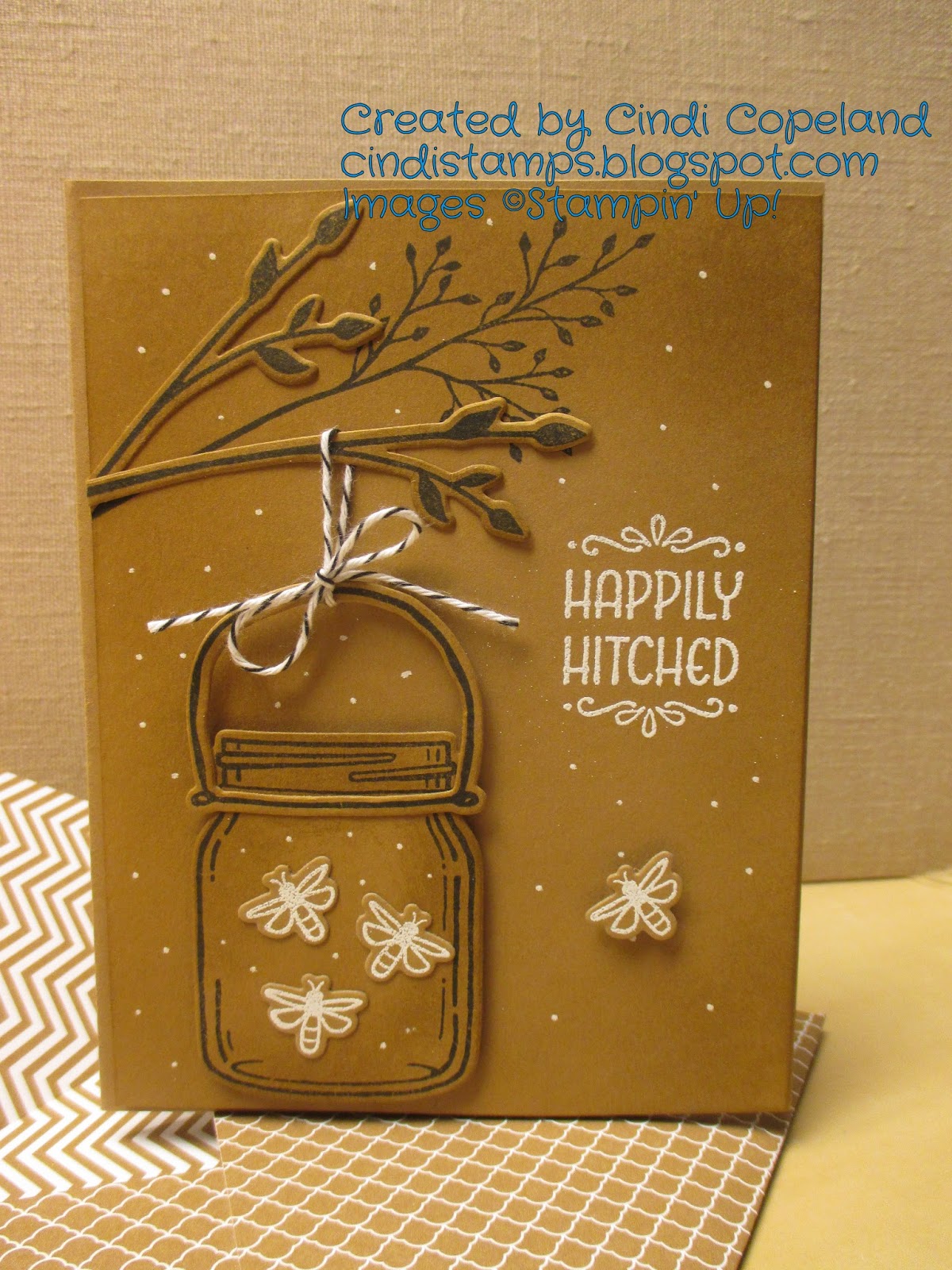 For the card base, I pulled out some retired Baked Brown Sugar cardstock, and used it for all the other elements as well. The branches, jar, and holder are all stamped with Memento Tuxedo Black, and the sentiment and fireflies were stamped with Versamark and heat embossed with white powder. I used a chalk marker to add the dots, and the edges of the card front and the added elements are sponged with Baked Brown Sugar ink.