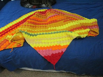 Here are a couple of photographs of the blanket so far. Notice the photobombing cat! :)