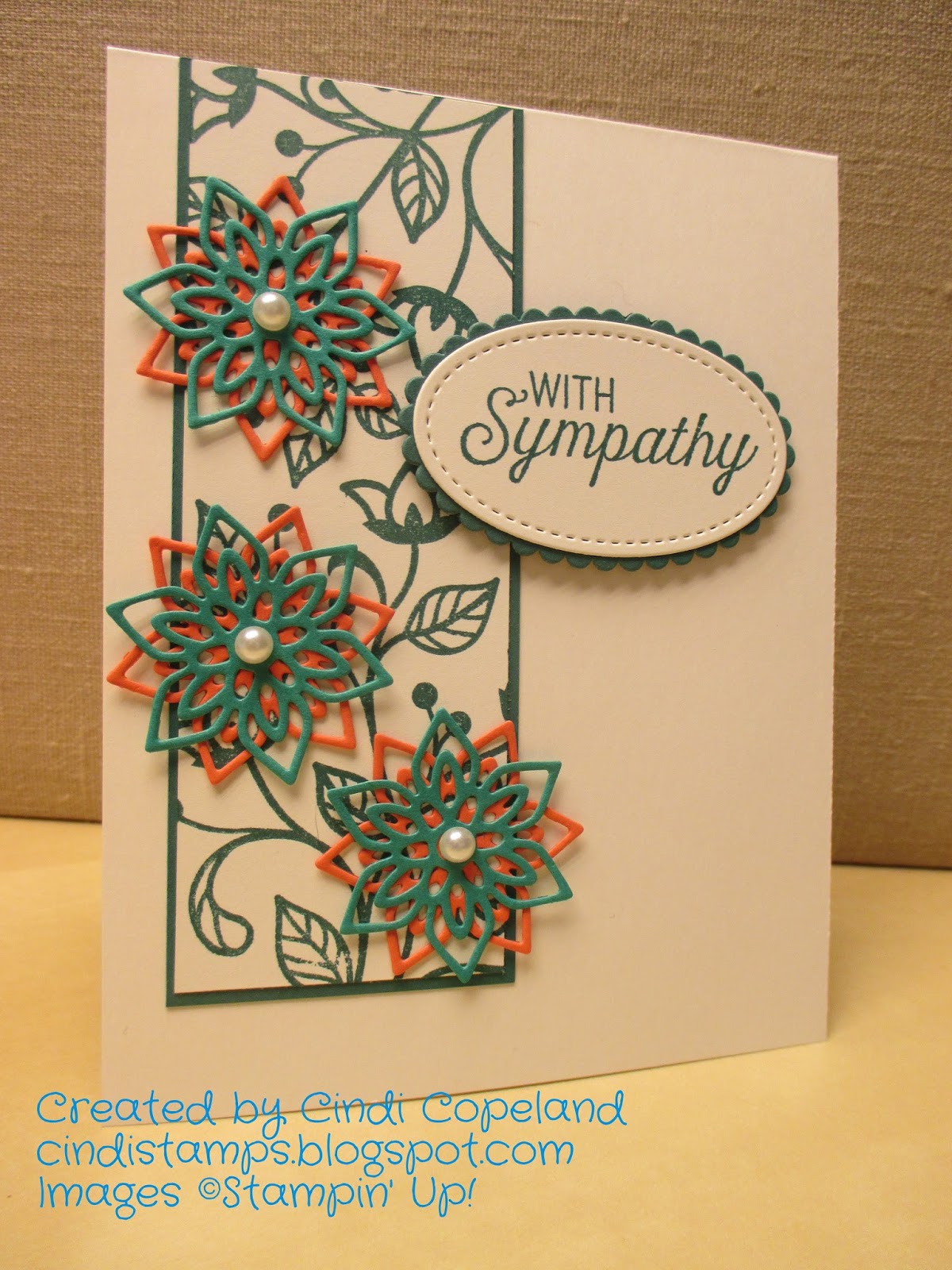 I wanted to try one of the new In Colors on this card, so I pulled out the Tranquil Tide ink and cardstock. I used the large stamp from Flourishing Phrases to create the side panel, then added flowers cut from Emerald Envy and Calypso Coral with pearl accents. The sentiment was stamped and cut with the Stitched Shapes oval and backed with a scalloped Layering Oval. I even refrained from adding ribbon to this one, because I wanted to keep it really simple.